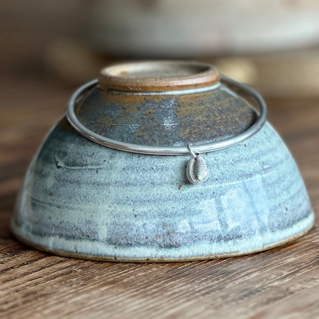 The tiny cowrie is cast in sand by hand using recycled sterling silver.