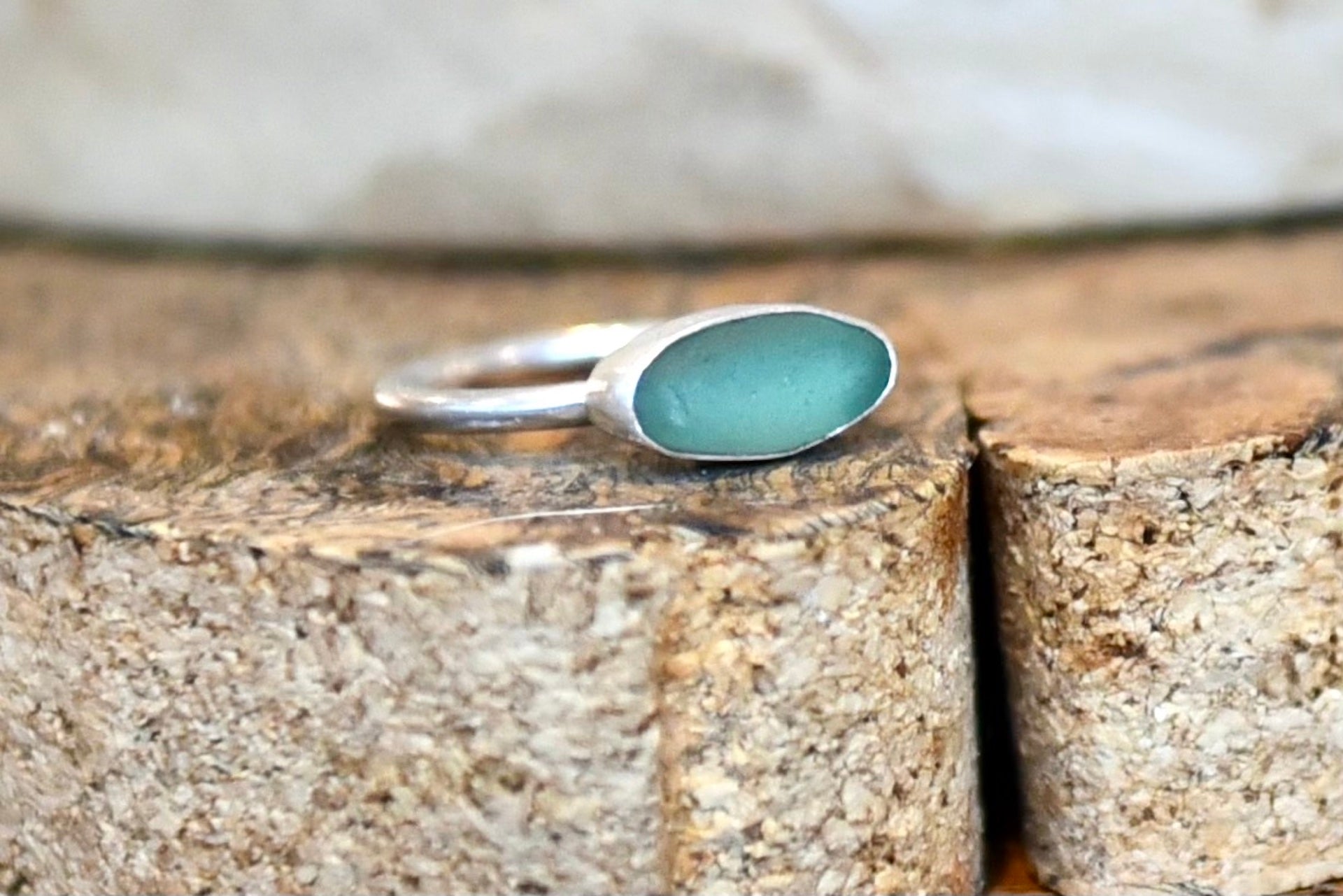 A beautiful oval shaped sea glass ring in sea foam. Set in a sterling silver bezel on a round band, size O.